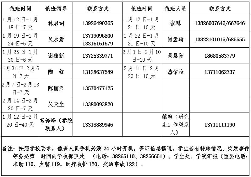 后附:学院值班表(学生工作值班表、)、教育技术中心值班表、实验中心值班表、职业教育师范技能训练中心寒假值班表。