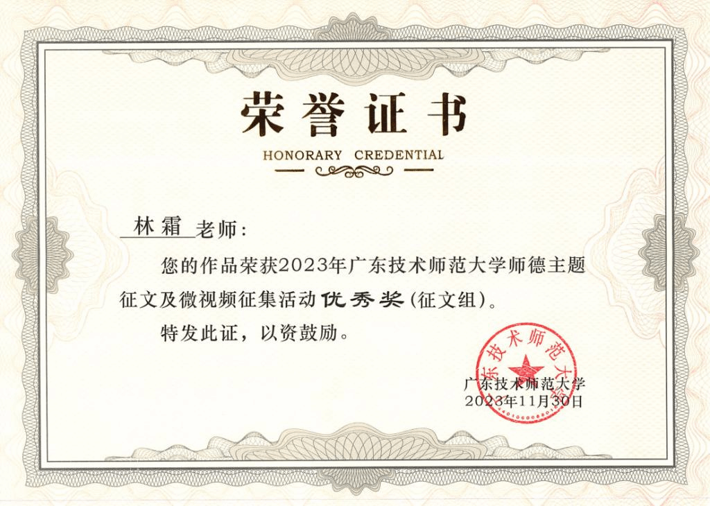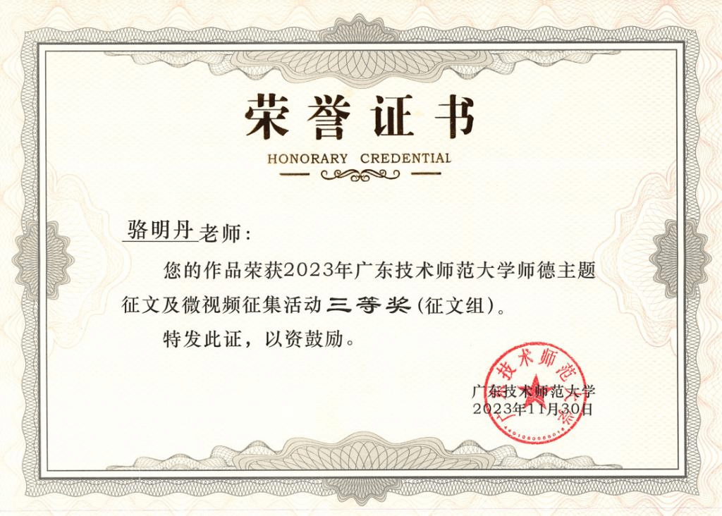 近日,学校公布了2023年围绕“躬耕教坛 强国有我”师德主题征文及微视频征集活动评选结果,bevictor伟德官网取得可喜成绩。全校29个二级单位的投稿作品88件(征文71篇、微视频17个),bevictor伟德官网报送的《心之所向,行之所往》(作者:骆明丹老师)荣获征文三等奖,《新时代,新担当》(作者:林霜老师)荣获征文优秀奖。《“双带头人”教师党支部书记工作室建设工作》(作者:陈名祎老师、赵玉教授)荣获微视频优秀奖。
