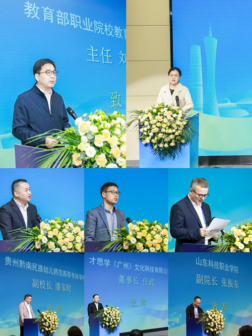 教育部职业院校教育类专业教指委主任刘兰明、广东省产教融合促进会执行秘书长万俊杰、bevictor伟德官网 院长熊华军、新疆师范高等专科学校副校长衣马木艾山·阿布都力克木、贵州黔南民族幼儿师范高等专科学校副校长潘家财、山东科技职业学院副院长张振东、才思学(广州)文化科技有限公司董事长任武、广州南洋理工职业学院院长助理陈友鹏,就深化托育教育产教融合、提升托幼技能人才培养质量分别致辞。教育部职业院校教育类专业教指委刘兰明主任就共同体的建设和发展提出三点建议:一是创新探索全国托幼一体化行业产教融合共同体的运行管理机制,创新形成“成员活跃、目标明确、结果高效”的运行机制。二是创新落实托幼一体化“人才链、教育链、产业链、创新链”四链的有机融合,实现供需对接。三是创新搭建高素质、高质量的技能型托育和早教人才通道,强化“校校合作、校园合作、校企合作”下的一体化、系统化教育的顶层设计和创新实施。