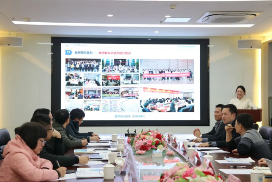 蔡宗山副总表示,职业教育的产教融合、科教融汇涵盖了众多学术理念,从实践落地和资源整合的角度来看,仍需要与我校深度合作。随后,卢婉晴总监就数字技术产品生态、服务体系及成果案例进行了分享,同时探讨了产教融合的推进思路。陈聪经理深入剖析了产教对接谱系的研制路径,并进一步探讨大数据在产教对接中的作用,利用大数据技术构建起专业和产业之间的联系。胡思成经理对职教桥数字化生态进行了详细介绍。