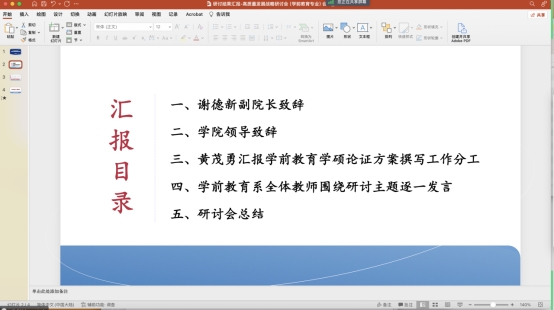 接下来,熊华军院长明确指出学前教育系要举数字大旗,穿巨身理论鞋,披双能(技能/师能)盔甲,走品牌之路,开辟0-6岁婴幼儿新赛道。另外,熊华军强调要积极组建团队,开展有组织的高水平科研。攻克重难点工作助推博士点建设。随后,系主任黄茂勇老师对学前教育学硕论证方案撰写工作进行详细分工。