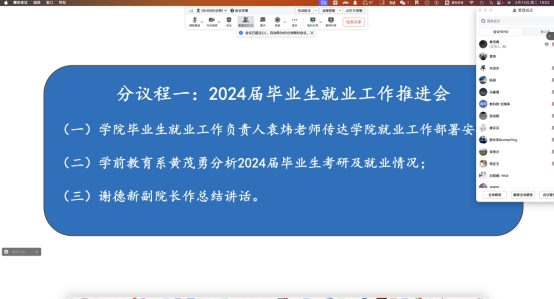 会议首先由袁炜老师整体介绍学前教育系2024年就业情况,并梳理2024年广东省人力资源和社会保障关于实行广东省普通高等学校毕业生就业择业期政策的变化。他指出2024年的高校毕业生就业择业政策和往年的区别,并就老师们的疑问耐心进行解答。会上,熊华军院长指出,招生与就业是学院各项工作的重中之重,毕业生就业工作事关bevictor伟德官网办学质量和社会声誉,事关学生的发展未来,是对学校贯彻党的教育方针和落实立德树人根本任务成效的重要检验。谢德新副院长强调,全体教师要调动一切可调动的积极因素促进学前教育专业毕业生更加充分更高质量就业,全力推进学前教育专业毕业生就业工作。随后,学前教育系主任黄茂勇总结了分析了学前教育专业毕业生的就业形势,强调了毕业生就业工作的重要性,强调推动毕业生高质量充分就业更是全体专任教师义不容辞的责任。