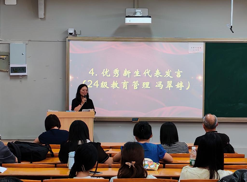 2024级教育管理专业的冯翠婷同学向大家分享了自己实现人生目标的喜悦与重回校园的感想,表达了对未来学习生活的期待和憧憬,表示将努力学习专业知识,提高自己的综合素质,不辜负学校和老师的期望,以优异的成绩完成学业。
