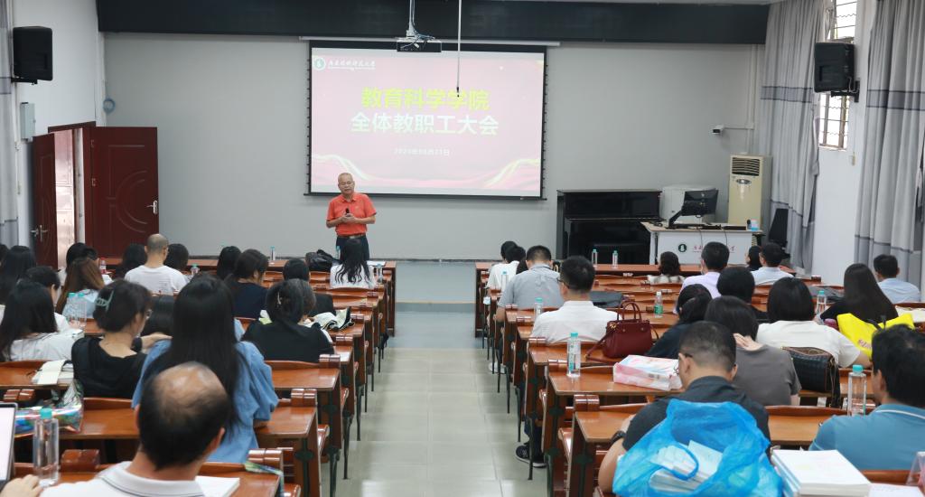 会上,熊院长对全体教师上学期的工作成绩表示肯定。熊院长表示在全体教职工的努力下,上个学期教科院打造了“七大亮点”:教授职称评审大满贯、国自课题的突破、应用心理学硕士点申报公示、顶尖期刊论文的发表、教师科研用房顺利推进、“双百工程”专班成效突出、心理学实验室完工等。在新学期,熊院长鼓励全体教职员工要“抓紧时点”,一是参与到河源纵向帮扶一县一策、一校一品的撰写当中;二是参与中高本一体化托幼服务新形态职业教育教材的开发中;鼓励教师们围绕“四重”(重大课题、重大平台、重大奖励、重点人才)与“五金”(金专、金课、金材、金师、金地)等方面勇挑重担、克服困难,让学院更上一层楼。