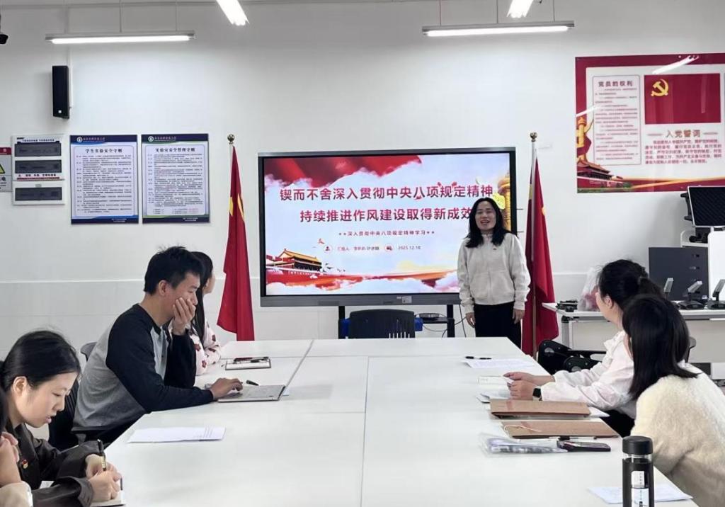 活动伊始,党支部组织委员叶水娟同志以“锲而不舍深入贯彻中央八项规定精神,持续推进作风建设取得新成效”为主题,领学了第一议题。她首先回顾了中央八项规定出台的时代背景和深远意义,指出八项规定是新时代推进全面从严治党的切入口和动员令,是党密切联系群众、改进工作作风的重要举措。叶水娟同志结合当前形势与高校党建工作实际,系统解读了八项规定精神的核心要义,重点阐述了在调查研究、会议活动、文件简报、出访活动、警卫工作、新闻报道、文稿发表、勤俭节约等八个方面的具体要求。她强调,作为学生党员和入党积极分子,必须深刻认识作风建设的极端重要性,自觉将八项规定精神内化于心、外化于行。