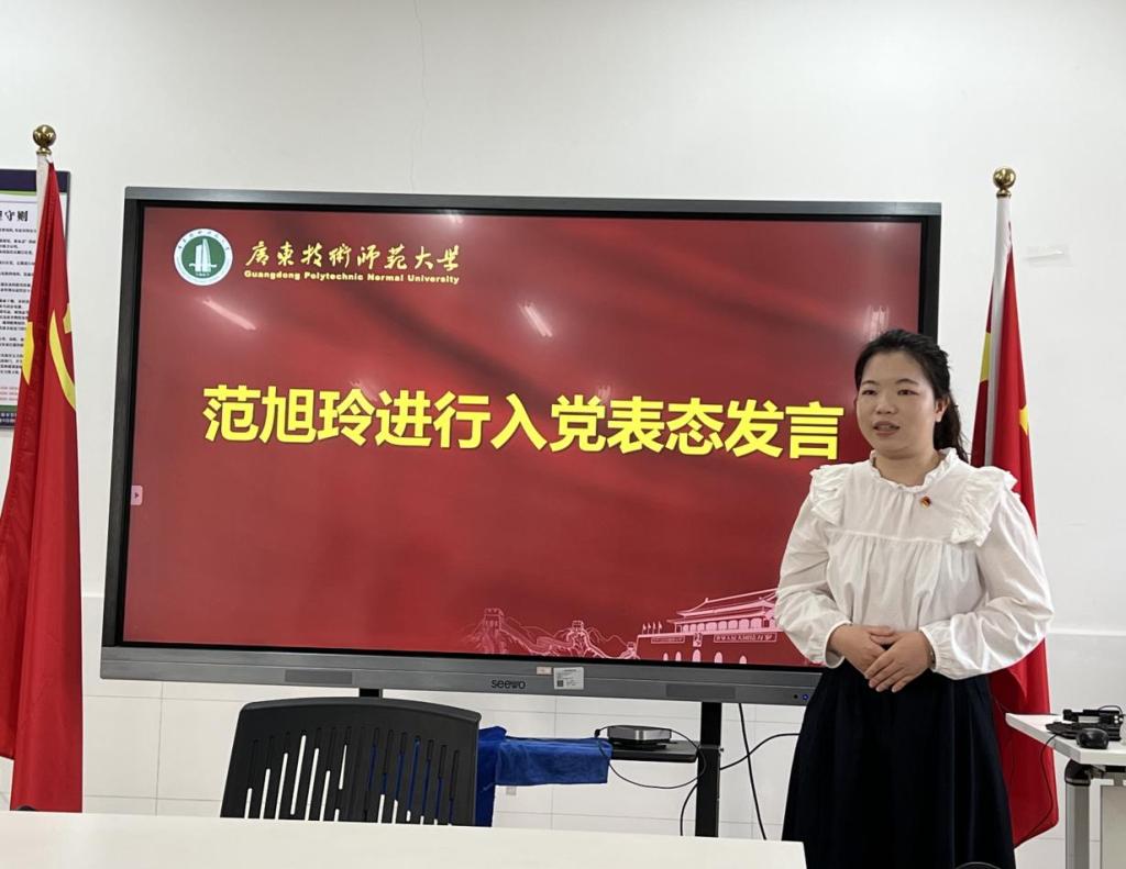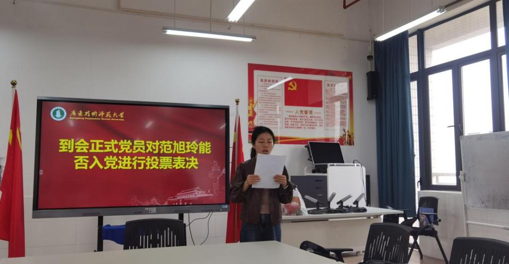 在扎实的理论学习之后,大会严格按照《中国共产党发展党员工作细则》规定的程序,对发展对象范旭玲同志入党问题进行了充分讨论和表决。第一项议程,由发展对象范旭玲同志向支部大会汇报情况。范旭玲同志结合自身成长经历和思想演变过程,详细汇报了对党的认识、入党动机、本人履历、家庭和主要社会关系情况,以及需要向党组织说明的问题;第二项议程,由入党介绍人卢凯敏同志和张玉婷同志分别介绍范旭玲同志的有关情况,并对其能否入党表明意见。两位介绍人一致认为,范旭玲同志已基本具备共产党员条件,愿意介绍其加入中国共产党;第三项议程,由党支部组织委员叶水娟同志代表支部委员会报告对范旭玲同志的审查情况。报告详细说明了支部委员会对范旭玲同志的政治审查过程、直系亲属和主要社会关系的政审情况,以及征求党内外群众意见的情况。支委会认为,范旭玲同志政治历史清楚,一贯表现良好,符合党员条件,政审合格,同意提交支部大会讨论;第四项议程,大会进行无记名投票表决。计票结果显示,赞成接收范旭玲同志为预备党员的票数超过应到会有表决权正式党员的半数。根据规定,支部大会决议同意接收范旭玲同志为中共预备党员。