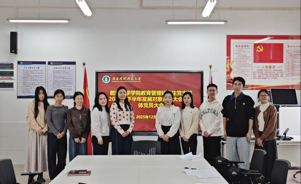 为贯彻落实全面从严治党要求,严格党员发展程序,提升党员队伍建设质量,教育管理研究生党支部于2025年12月10日在白云校区第二实训楼502会议室召开支部大会,讨论接收范旭玲同志为预备党员事宜。本次大会旨在通过规范、严谨的组织程序,进一步增强党支部的凝聚力和战斗力,同时也为全体党员及入党积极分子提供一次深刻的党性教育和纪律教育。支部全体党员、预备党员及部分入党积极分子参加了会议,大会由党支部副书记卢凯敏同志主持。