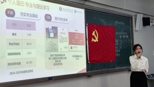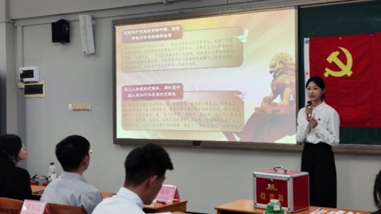 第一议题学习结束后,大会进入接收预备党员议程。按照发展党员流程,戴夏婷、宋雨妍、曾怡、符梓瑜、刘佩铷五名发展对象依次从入党动机、个人思想动态及学习实践成果等方面进行汇报。随后,发展对象现场抽取并回答相关问题。入党介绍人从政治素养与作用发挥等方面对发展对象进行全面评价,并提出针对性建议。接着,党员进行了随机提问,发展对象现场答辩。答辩结束后,纪检委员黄亚良同志代表支部委员会报告了对五位同志的综合考察情况。