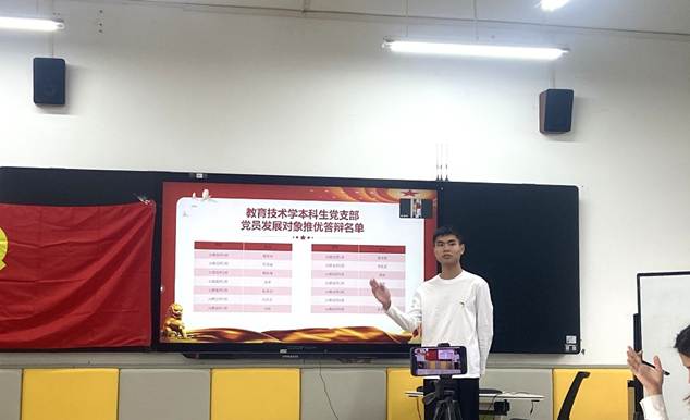2026年4月24日,教育技术学本科生党支部在二训506召开2026年上半年党员发展对象推荐答辩会议。教育技术学本科生党支部全体党员参加了会议。本次活动由党支部副书记黄梓亮主持。