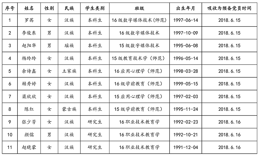 我院陈红等11名同学于2018年6月15日、16日分别被批准为中共预备党员,现预备期即将满一年。经本人申请、党组织考察,拟于近期召开党支部转正大会。为贯彻落实党员发展工作民主公开、公正透明的要求,确保新发展党员的质量,根据《中国共产党章程》和《中国共产党发展党员工作细则》,现将近期拟转正的预备党员情况予以公示。