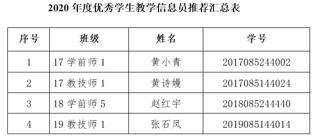 教育科学与技术学院2020年度学校优秀学生教学信息员评选,共有8位学生参评,学院本着公平公正公开的原则,对各位参评学生的申请进行审核并集中讨论,最终拟推荐以下4位学生: