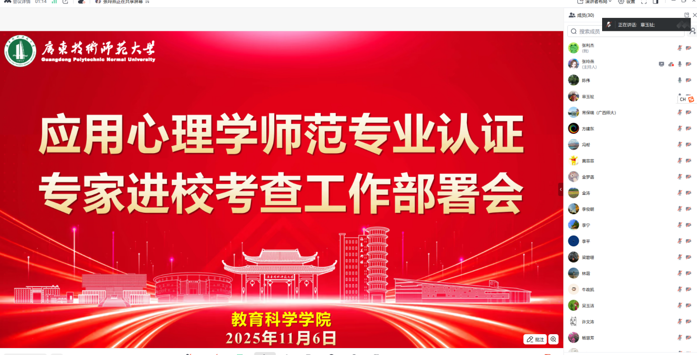 2025年11月6日晚,我院召开应用心理学师范专业认证专家进校考查工作部署会。会议由应用心理系专业负责人章玉祉主持,学院党政领导班子、应用心理专业全体教师以及学院全体工作人员参加会议。