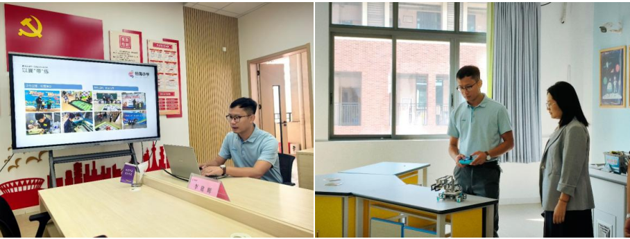 怡海小学老师信息科技老师李建辉老师以“怡美教育下的创客实践”为核心,从学校“求真向善、求向尚美”的校训出发,详细介绍了学校在创客教育、学科融合教学等方面的特色发展现状。他通过“以赛‘带’练”的主题汇报,展示了学校在少年创客培养中组织的各类竞赛活动,以及科技赋能校园、促进学生全面发展的实践成果,让曹老师对学校的教育教学理念与特色有了深入了解。