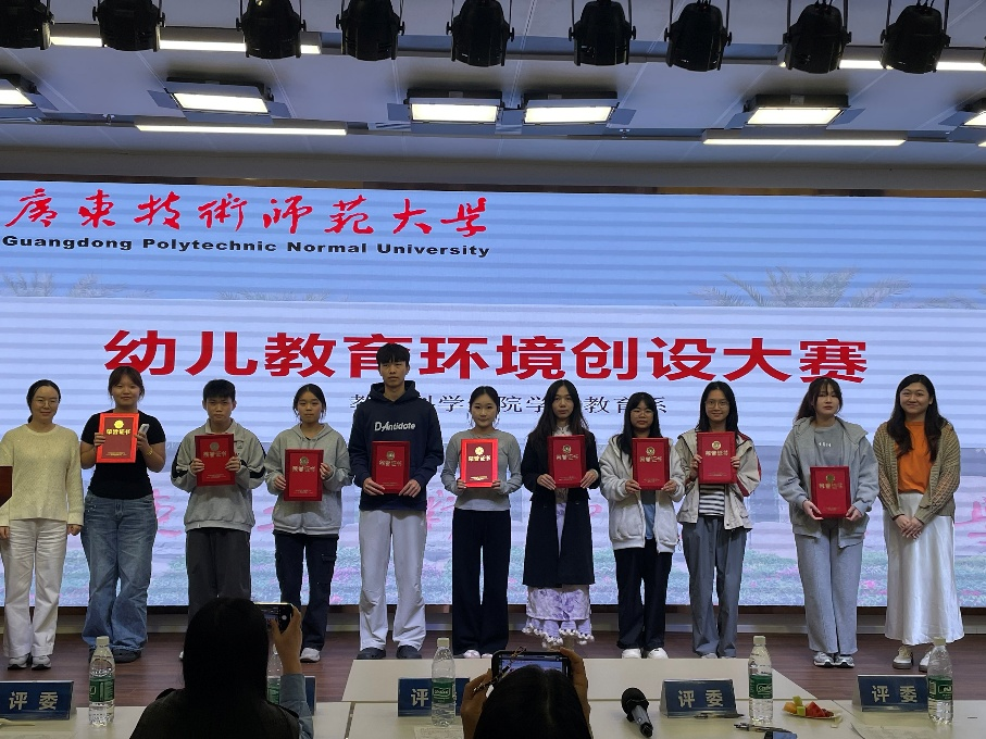 本次大赛特邀广州市黄埔区东港幼儿园林漫琼园长、广州市白云区景泰街中心幼儿园方洪妹教研员,以及学前教育系徐艳贞主任、林晓雯老师担任评委。评委们从教育性、实用性、创新性等多维度进行评审,并围绕环境创设的教育意义与实践路径作了精彩分享,为学生提供了宝贵的专业指导。