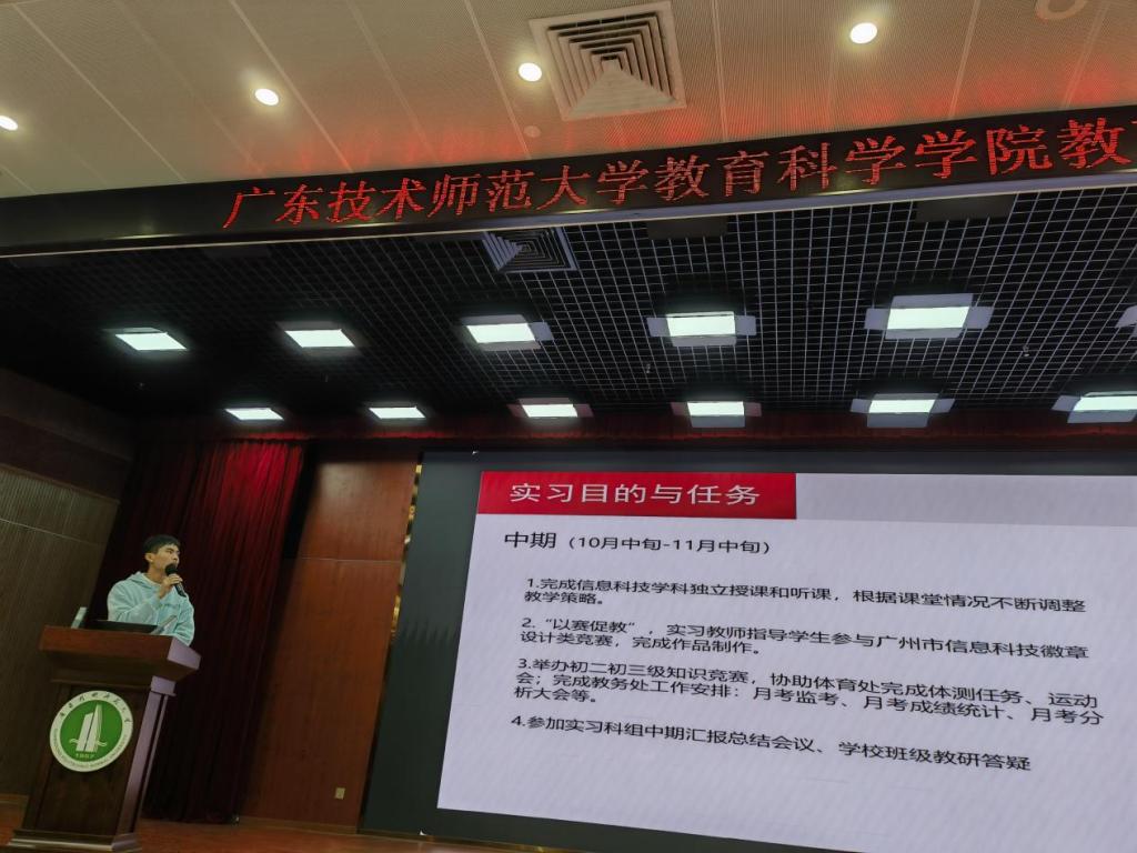 此外,其他实习小组也分别汇报了各自的实践情况。汇报中,同学们还分享了处理课堂突发情况、参与大型教育会议、协助设备维护等难忘经历,部分小组现场展示了实习总结视频,让在场师生直观感受到实践中的成长与收获。针对2023级同学的疑问与困惑,已完成实习的2022级同学结合自身经历给出具体建议,强调要主动沟通、灵活应变,充分利用实习机会锤炼教学技能。