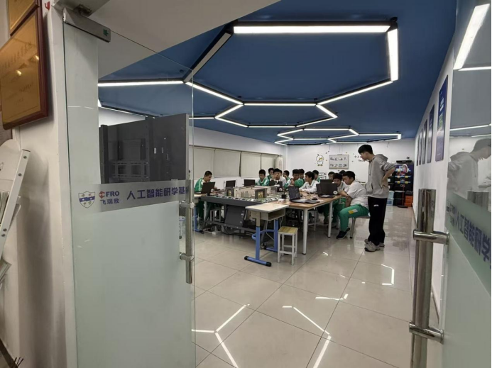 签约仪式结束后,在陈韶光老师和许月媚老师的带领下,赵玉教授和研究生们先后参观了南武中学的人工智能室、创客工作室等特色功能场馆。在人工智能室,工作人员详细介绍了室内配备的智能教学设备、课程体系以及学生在人工智能领域的学习成果,展示了南武中学在科技教育方面的雄厚实力;在创客工作室,各种学生自主设计制作的创客作品琳琅满目,充分展现了学生的创新思维和实践能力。
